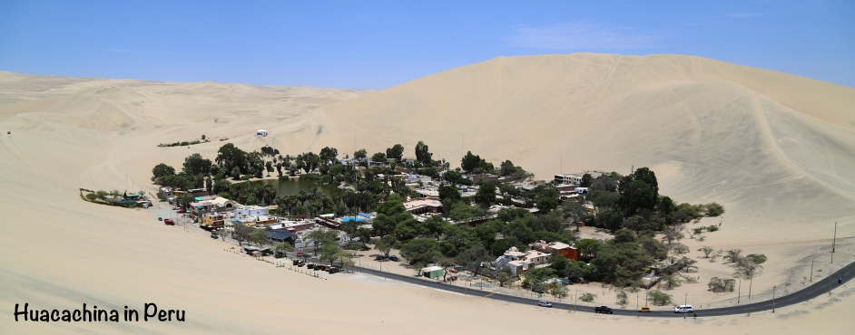 ペルーのイカにある砂漠のオアシス。ワカチナは砂漠内の小さな湖の周囲にありアメリカのオアシスとも呼ばれる。