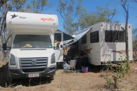 総勢12名で6人ずつに分かれて1週間のキャンピングカー生活。現地では人が多すぎて会場まで30分も歩くような場所しかなく… キャンピングカーをカーサイドタープが向き合う形で停めて拠点にした。